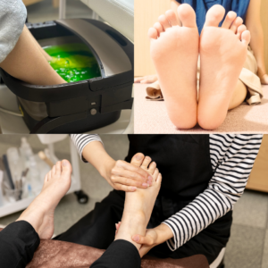 冬の間にたまった古い角質をフットバスで柔らかくしてから取り除き、保湿クリームでマッサージして仕上げます。